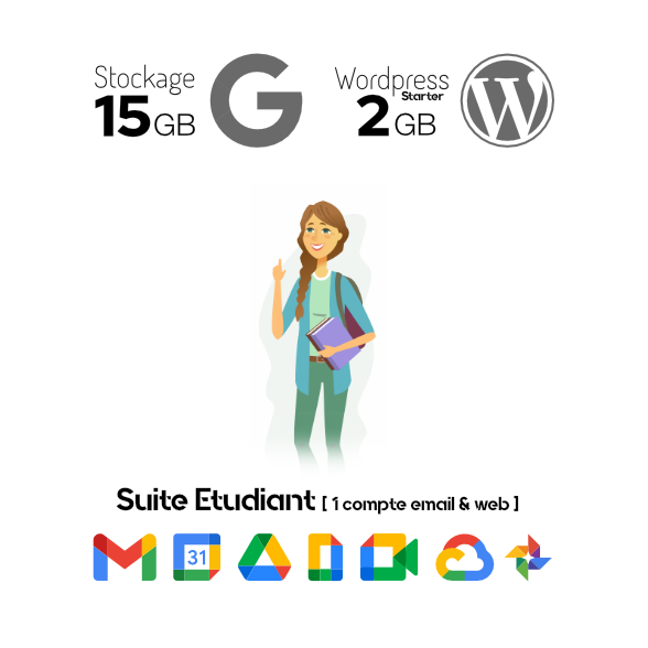 - Un compte Google Workspace incluant un email personalisé @leblanc.fr sur la plateforme Gmail. Stockages (15Gb, 30Gb, 150Gb ou 500Gb)