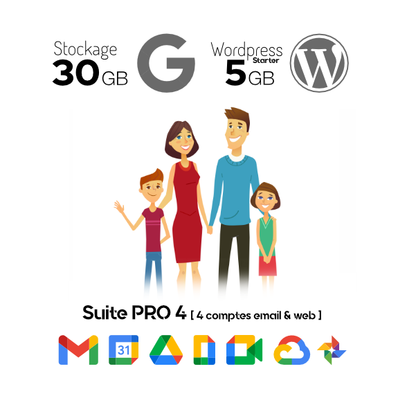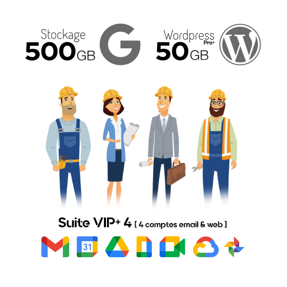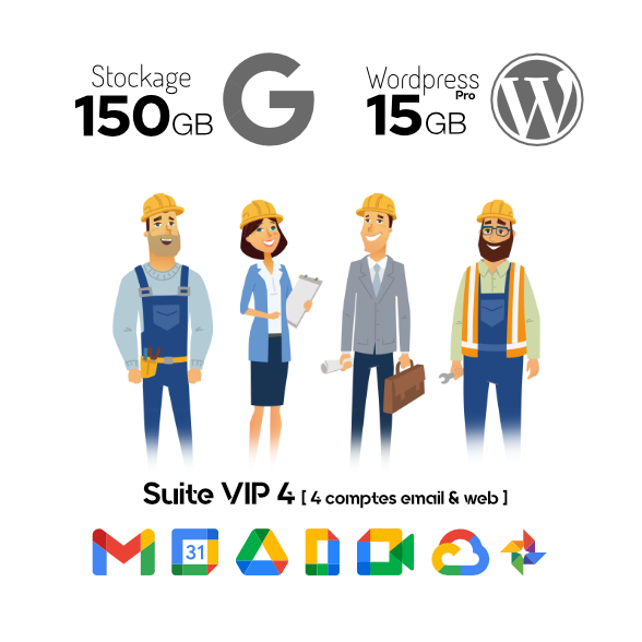 • Quatre comptes Google Workspace incluant  quatre emails personalisés @leblanc.fr sur la plateforme Gmail. Stockages (15Gb, 30Gb, 150Gb ou 500Gb)
